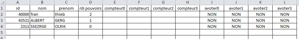 Ne sont collectés que les informations suivantes: id_unique, nom, prenom, le nombre de pouvoirs, un compteur de votes et un compteur pour savoir qui à_voter. Impossible de savoir qui à voter pour qui.
